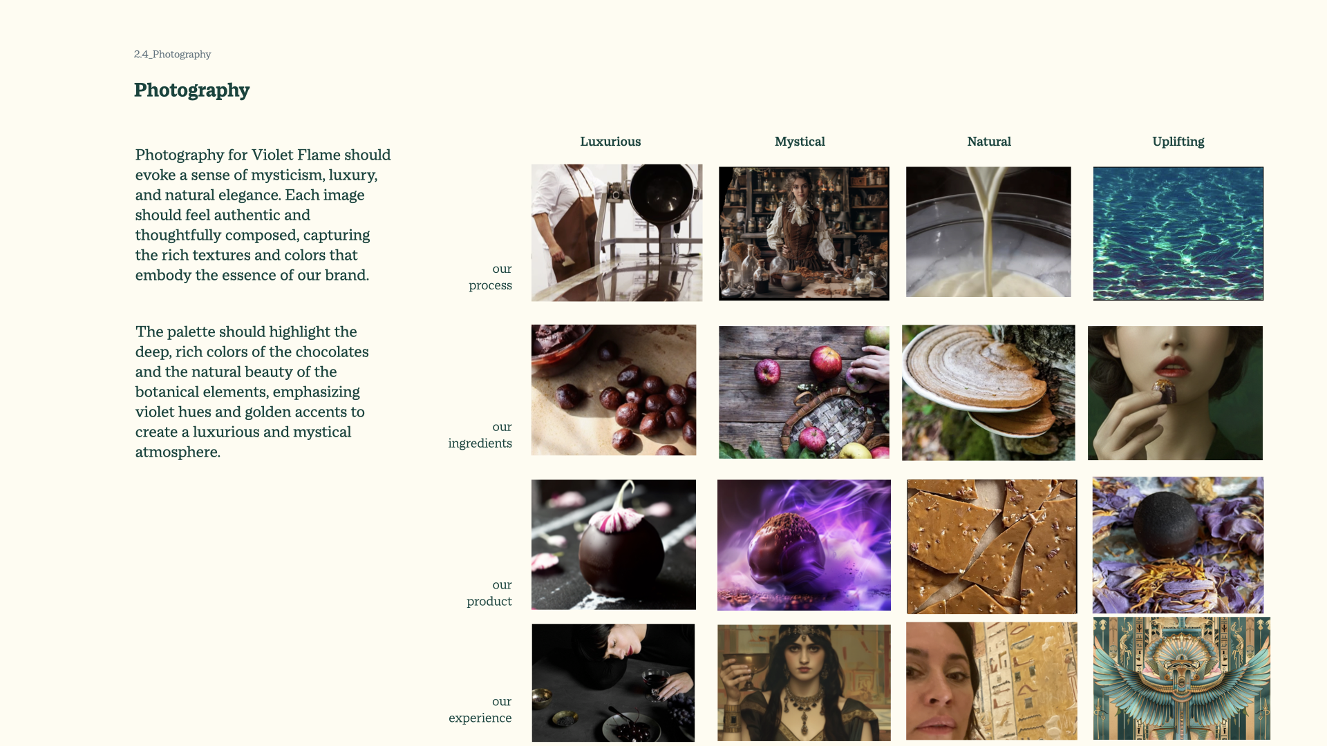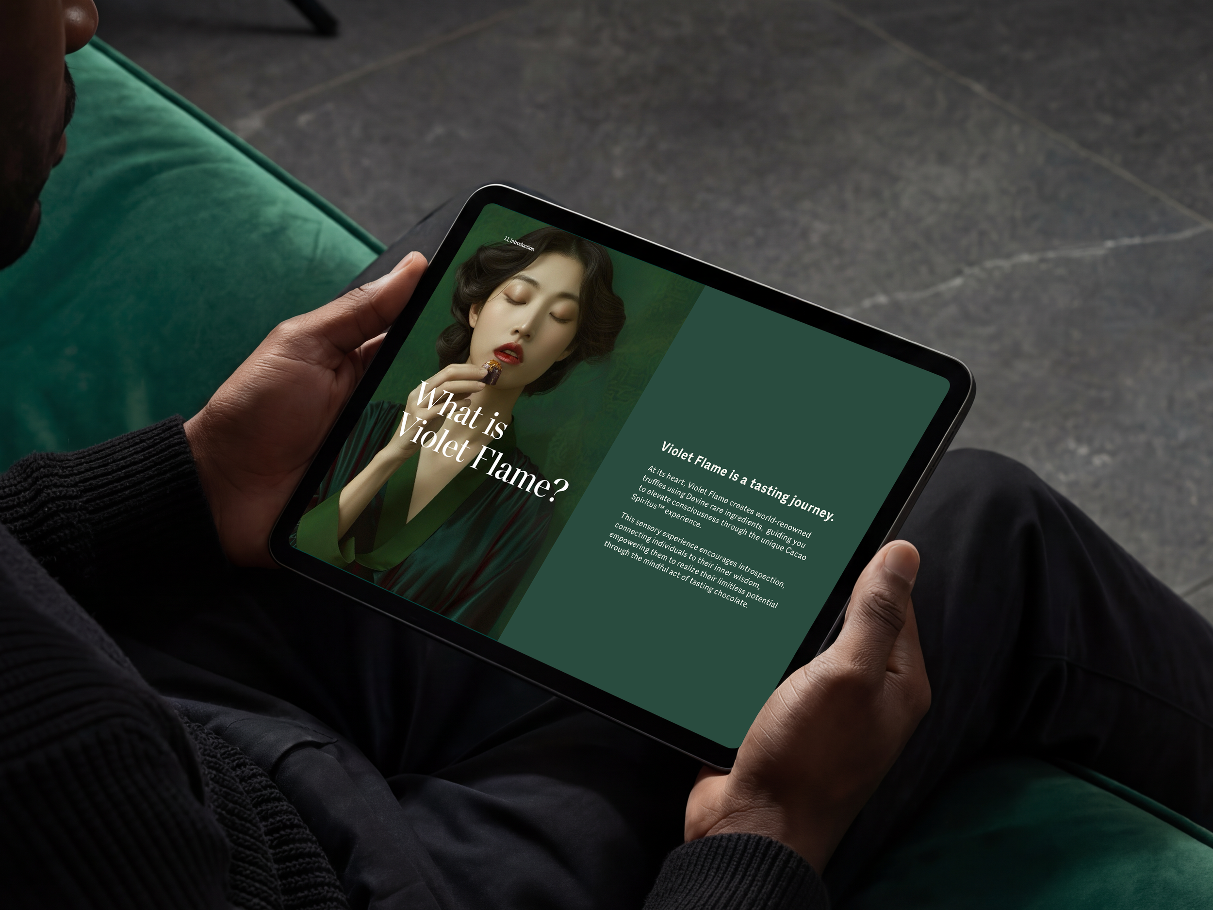 The central challenge was differentiation. This was ultra-luxury ritual chocolate with no real comparison in the market. Some of the audience was following the chocolatier's craft. A new audience needed to understand something different: that this chocolate was a ritual, a sensory pause designed to reconnect you to yourself. Getting both audiences to find their way in through the same door required the language to do real work. I developed the brand guide to answer the foundational questions: what is the value, what is the offering, what is the promise. The visual system followed from that thinking.